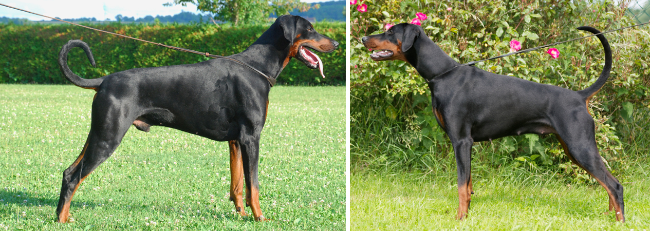 ALLGEMEINES ERSCHEINUNGSBILD: Der Dobermann ist mittelgroß, kräftig und muskulös gebaut. Durch die elegante Linienführung seines Körpers, die stolze Haltung, das temperamentvolle Wesen und den Ausdruck von Entschlossenheit, entspricht er dem Idealbild eines Hundes.